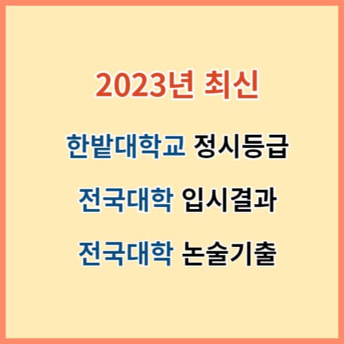 대전의 중심 유성구에 소재하며 개교 100주년을 앞둔 한밭대학교는 취업에 유리한 이공계 및 어문계열 학과와 설치되어 있어 충청권을 비롯한 전국의 학생들에게 꾸준한 관심을 받고 있는 대학입니다. 그래서 한밭대를 비롯한 상위권 대학 합격을 위해 불철주야 EBS 봉투 모의고사는 물론이고 수능인강까지 독파하고 전국 각지의 수험생 여러분께 힘을 드리고자 2023년 한밭대 ① 정시등급, ② 전국 50여개 주요 대학교 입시결과, ③ 2024학년도 논술고사 시행 대학교 기출문제를 무료로 제공 드립니다.